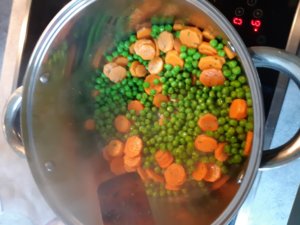 Egy lábasban felhevíted az olajat, melyben megpirítod a vékony répakarikákat, ez nagyjából 5-7 percet vesz igénybe. Nem kell, hogy látszólag is piruljon, inkább csak azt szeretnénk elérni ezzel az eljárással, hogy a benne található természetes cukor egy része távozzon, így hozzájáruljon a leves kitűnő ízéhez. Beleboríthatod a fagyasztott zöldborsót, keverd el, szórj a tetejére 1 ek. cukrot, ez lehet barna vagy sima fehér cukor is, természetesen édesítővel is készíthető. Szórj rá továbbá egy kis szárított vagy frissen vágott petrezselyemzöldjét, így párold 10-15 percig. Általában nem szükséges, de ha nagyon lekapja, önts hozzá 0,5 dl vizet.
